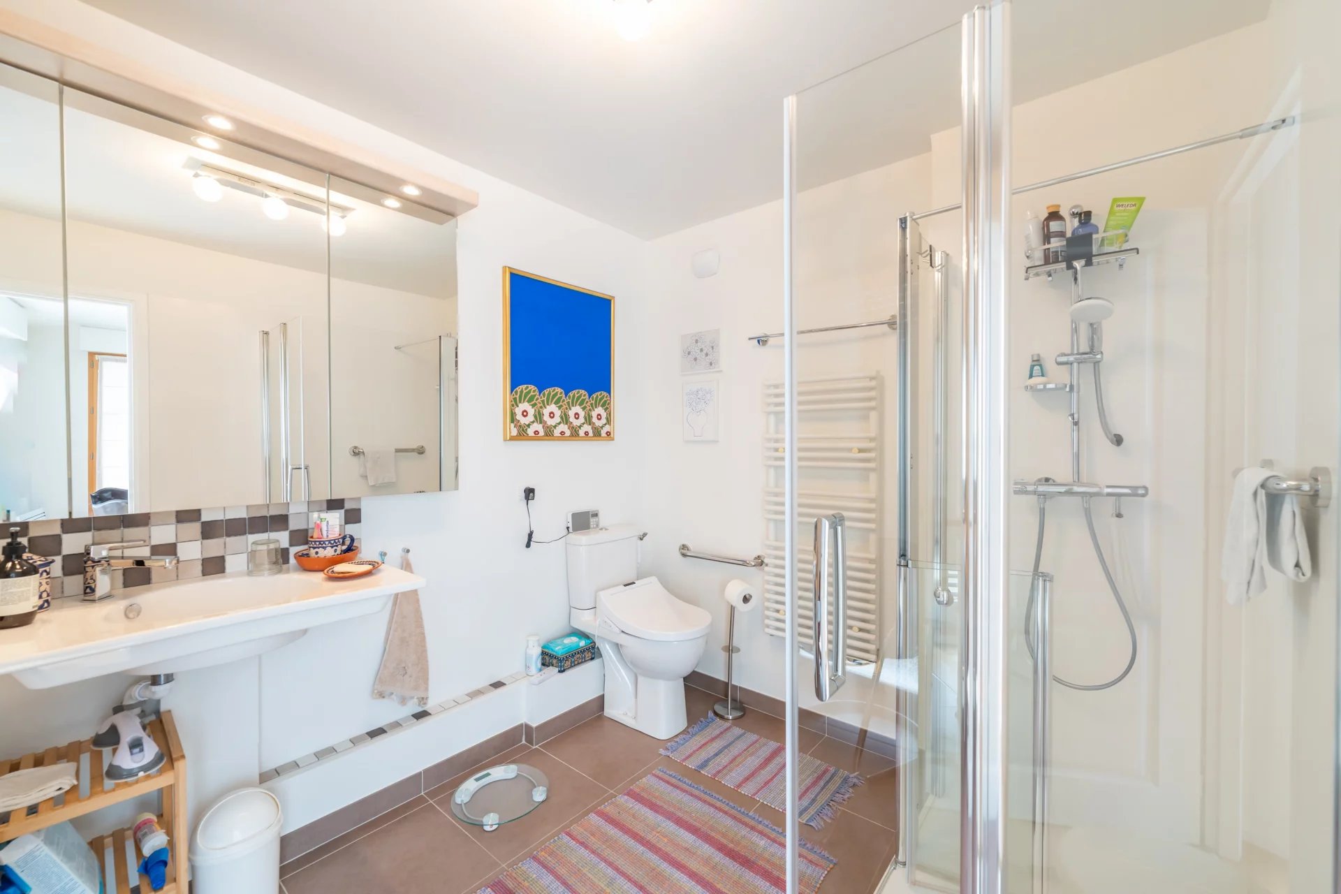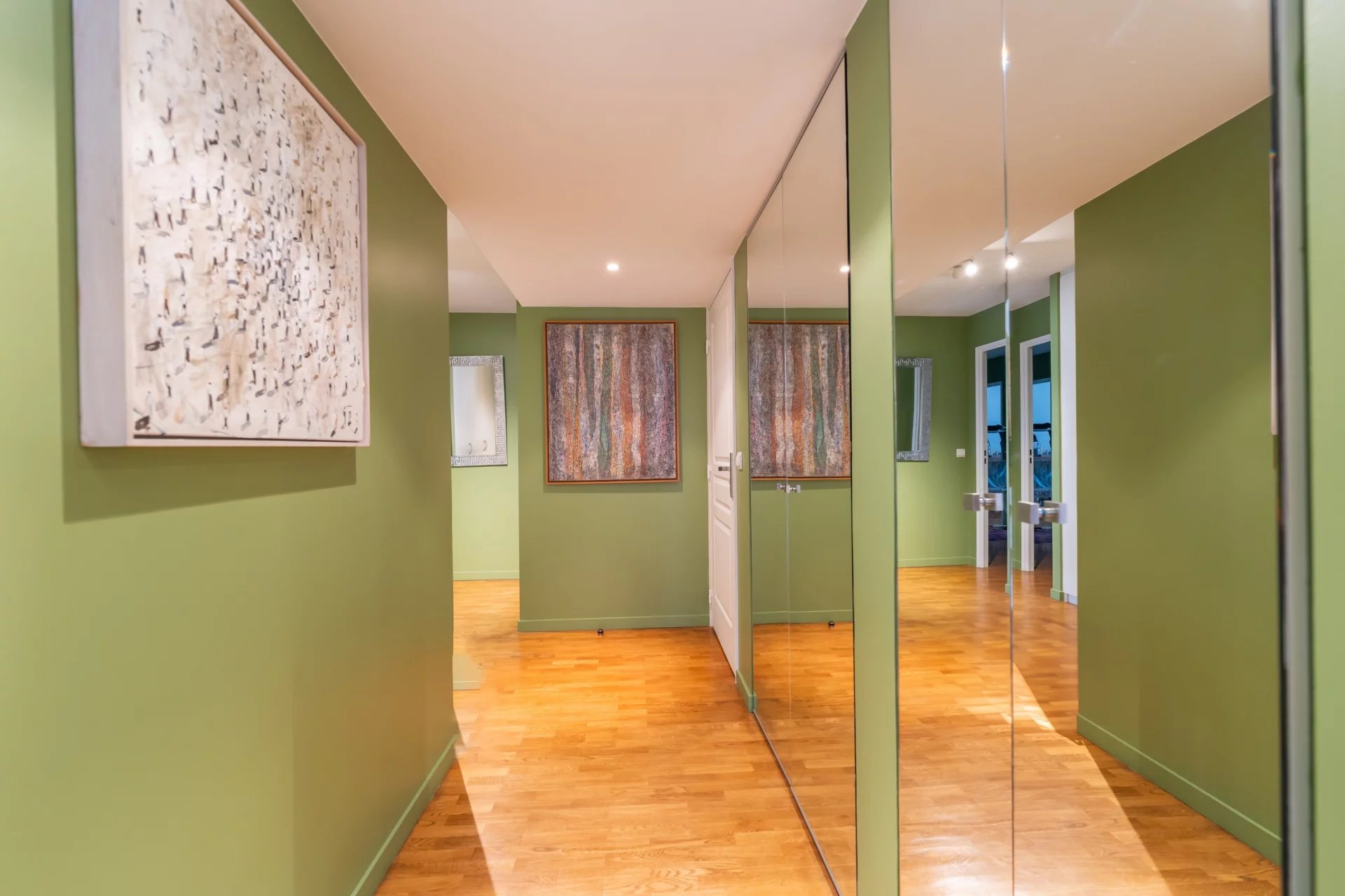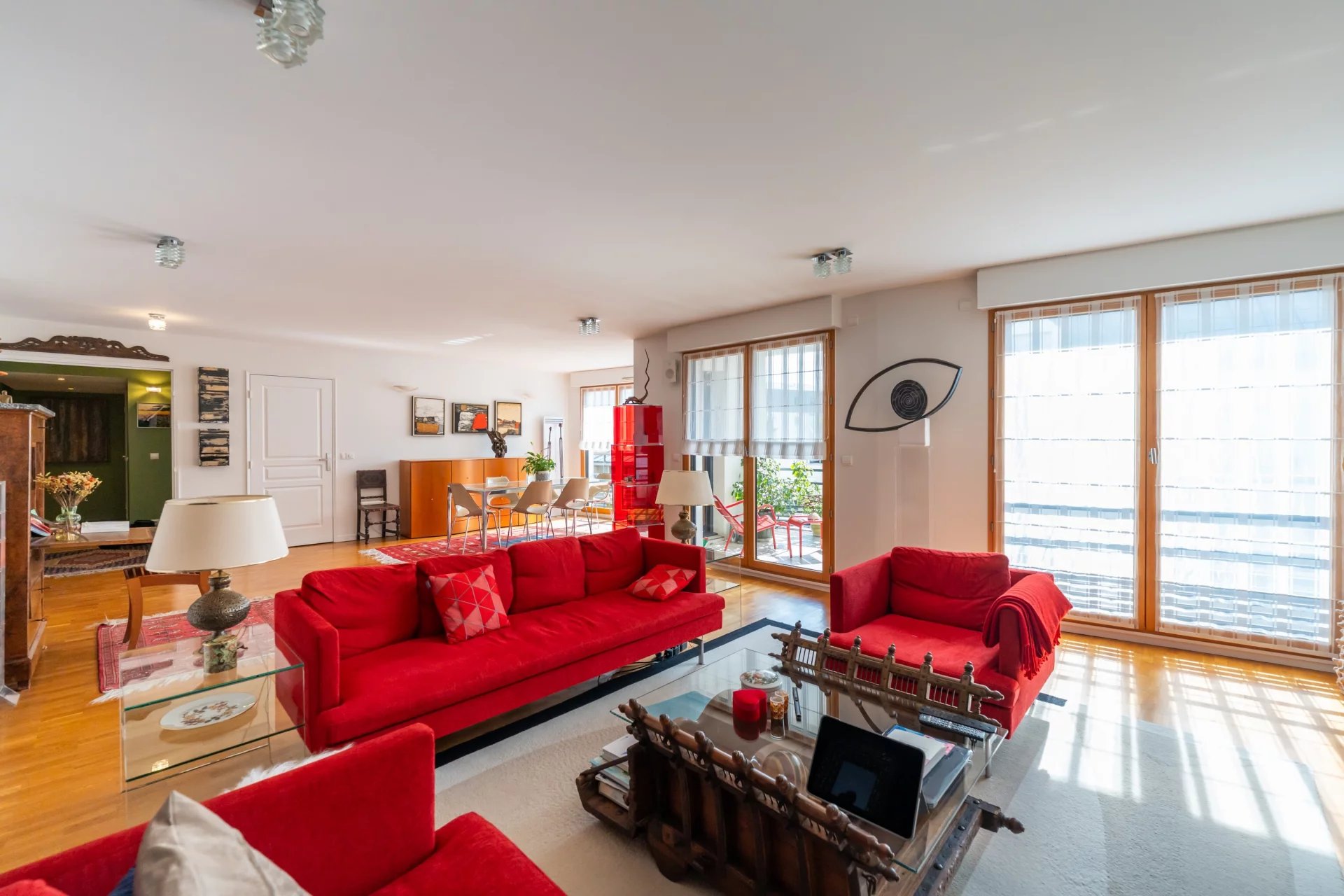 Il se compose d'une grande entrée avec placard sur mesure et toilettes séparées, suivie d'un double séjour / salle à manger de 50m2 prolongeant sur sa terrasse et sa cuisine équipée.